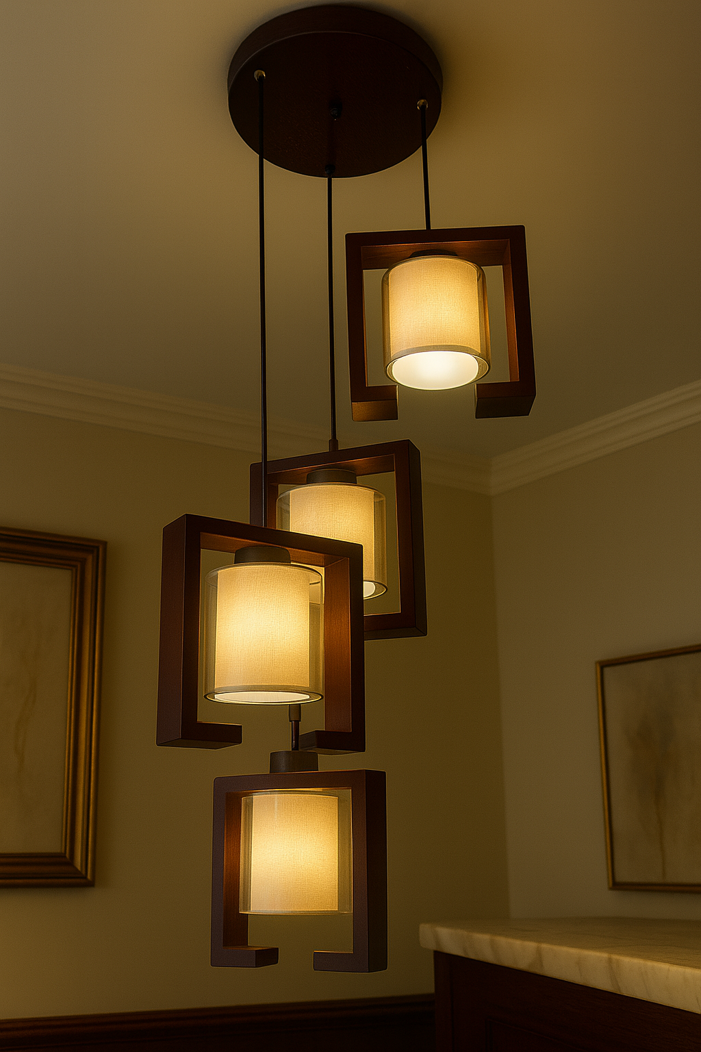 If you’re searching for a luxury designer pendant light India that blends modern geometry with warm lighting and natural elegance, this premium 4-pendant wooden frame hanging lamp is the perfect choice.