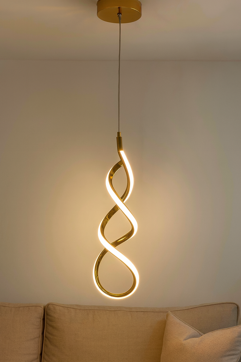 This pendant features a smooth, twisted LED strip wrapped around a polished gold frame. When illuminated, it produces a warm, comfortable light that spreads gently through the room. As a result, the pendant becomes both a decorative piece and a functional light source.