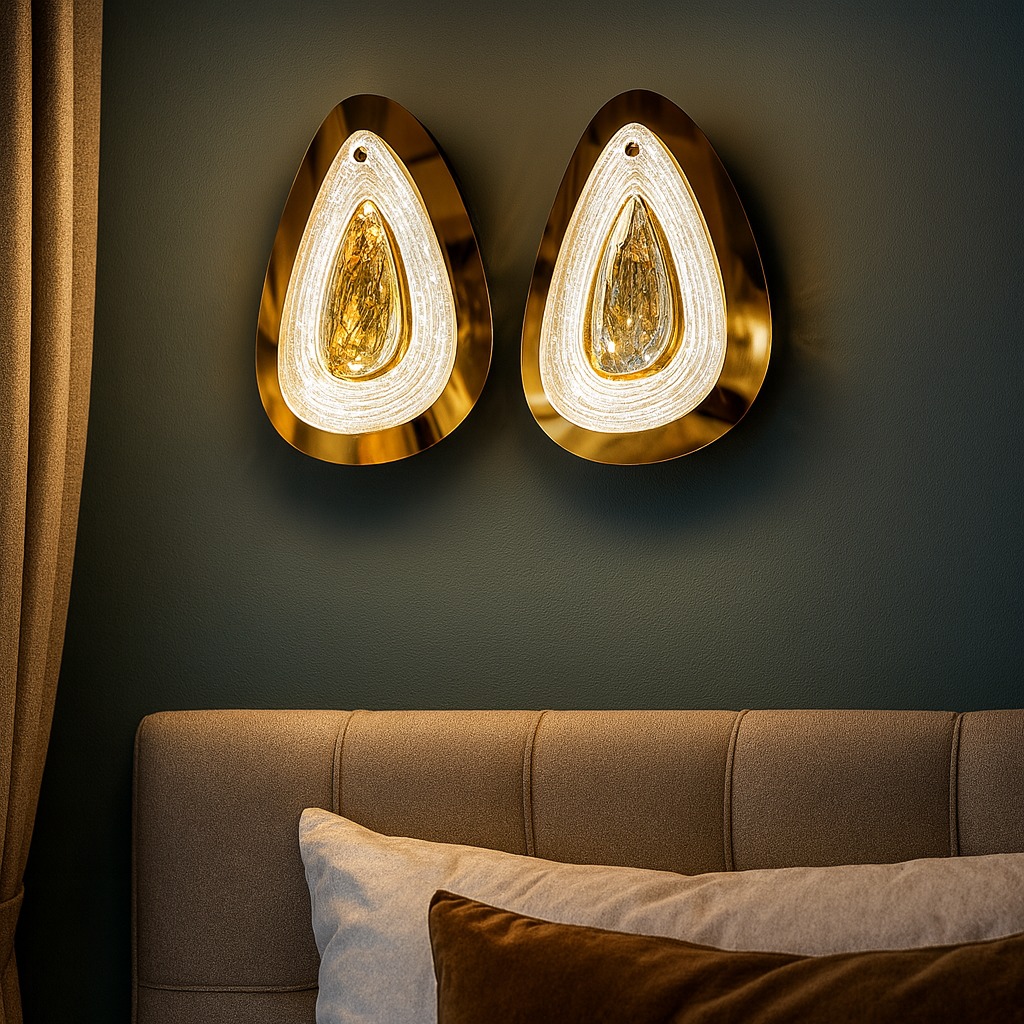 This statement wall sconce blends luxury home lighting, contemporary craftsmanship, and a refined gold aesthetic to create a visual centerpiece suitable for bedrooms, living rooms, hallways, and premium hospitality suites. Designed with meticulous precision, the fixture features a sculpted teardrop-shaped body with radiant gold reflections and a textured crystal-effect interior that disperses warm ambient lighting.